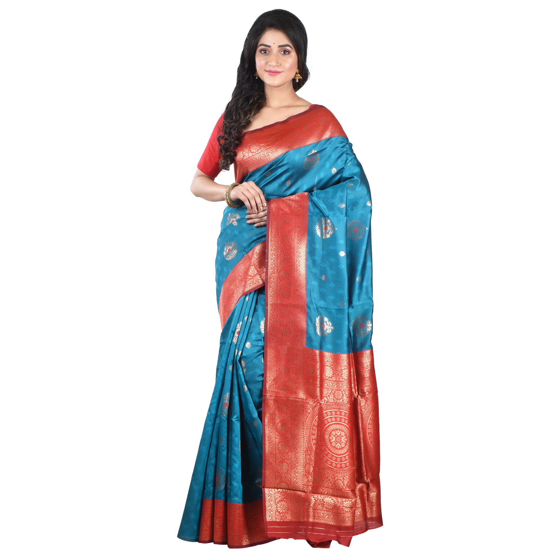 👉Teal green with copper zari and red thread meenakari work